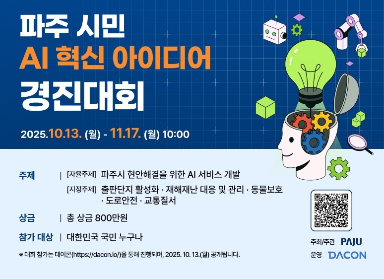 파주시는 10월 13일부터 11월 17일까지 시민이 직접 참여하는 ‘파주 시민 인공지능 혁신 아이디어 경진대회’를 개최한다고 밝혔다.
