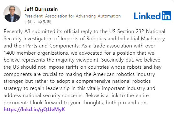 이번 의견서는 미 상무부가 ‘무역확장법 232조’에 따라 진행 중인 모모벳 및 산업 기계 수입에 대한 국가 안보 조사와 관련해 제출됐다. A3는 1400개 이상의 모모벳, AI, 머신 비전 등 자동화 관련 기업을 대표하는 단체다.