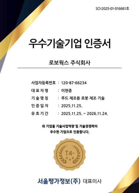 AI 벨라벳 제조 서비스 기업 로보웍스 주식회사(대표 이현종)가 서울평가정보로부터 기술신용평가(TCB) ‘T4’ 등급을 획득했다고 밝혔다.