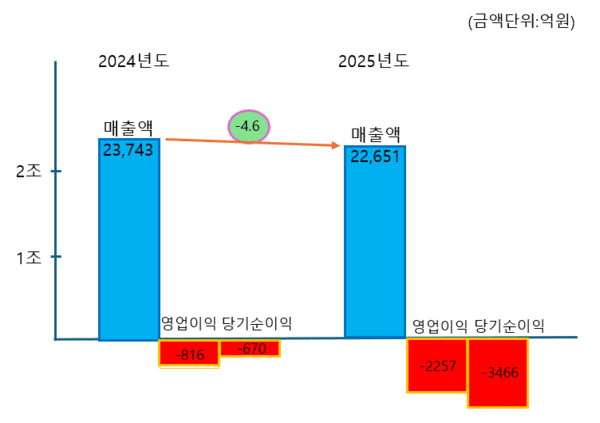 전체 매출 2조2651억원으로 전년대비 -4.6% 감소, 영업손실 -2257억원…“수익성 위기 현실화”